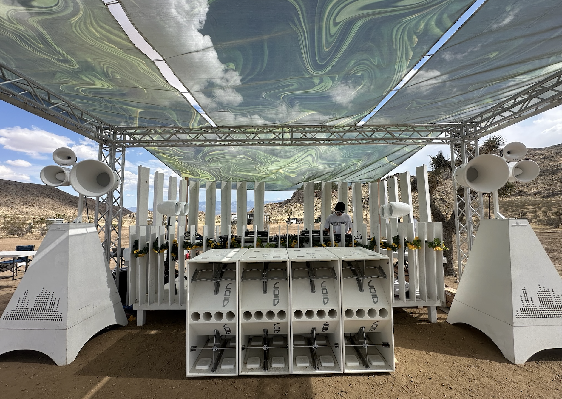 Bobby Jon Sound deployed a 4×4 Void stack for NZT Festival featuring 2 Air Motions, 2 Airten v3’s, 4 Stasys XV2’s and custom white speaker stands, creating a desert oasis.